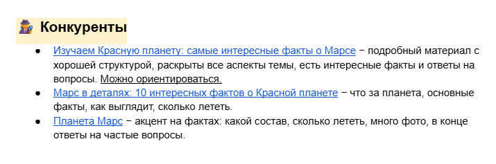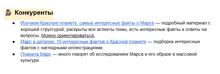 Наша задача не собрать конкурентов для галочки, а прикрепить ссылки на статьи, с которыми ознакомится автор. То есть заинтересовать журналиста так, чтобы каждого конкурента открыл и пробежался хотя бы по диагонали.