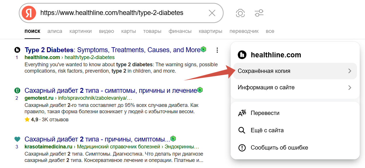 С «Яндексом» логика простая. Можно просто отправлять ссылку напрямую в поисковик, затем три точки, затем «Сохраненная копия». Пользоваться Cache.pw для этого не обязательно, но, к сожалению, далеко не все англоязычные сайты хорошо проиндексированы «Яндексом».