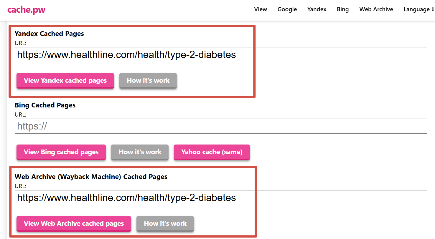 Ранее можно было посмотреть страницу в кэше напрямую через «Гугль» или «Бинг», но на вторую половину 2025 года эти методы уже не действуют. Остались «Яндекс» и «Веб-архив», но вместо того, чтобы рассказывать про каждый по отдельности, рекомендуем сервис Cache.pw.